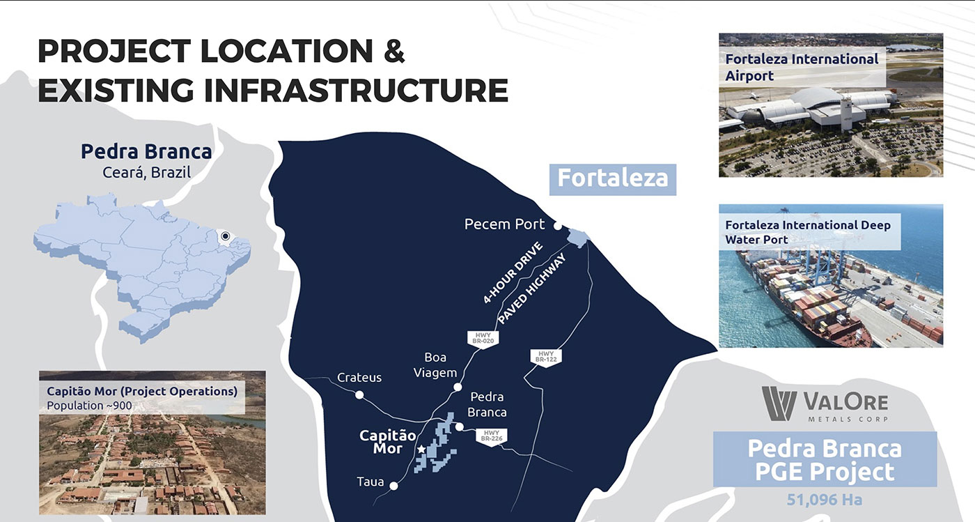 On May 28, 2019, ValOre announced a transaction to acquire 100% ownership of the Pedra Branca PGE District in north-eastern Brazil. A maiden NI 43-101 compliant inferred resource estimate of 1,067,000 ounces PGE+Au in 27.2 million tonnes grading 1.22 grams PGE+Au per tonne was calculated by ValOre at the time of the acquisition in 2019.