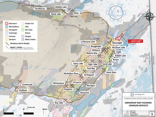 Hatchet Lake is 13,711-hectare uranium exploration project adjacent to the northeastern margin of the Athabasca Basin, situated along the underexplored northeast extension of the Western Wollaston Domain (“WWD”) and Wollaston-Mudjatik Transition Zone (“WMTZ”). This highly-prospective belt hosts the majority of known Canadian uranium deposits and all of Canada’s operating uranium mines (Figures 1 and 2).