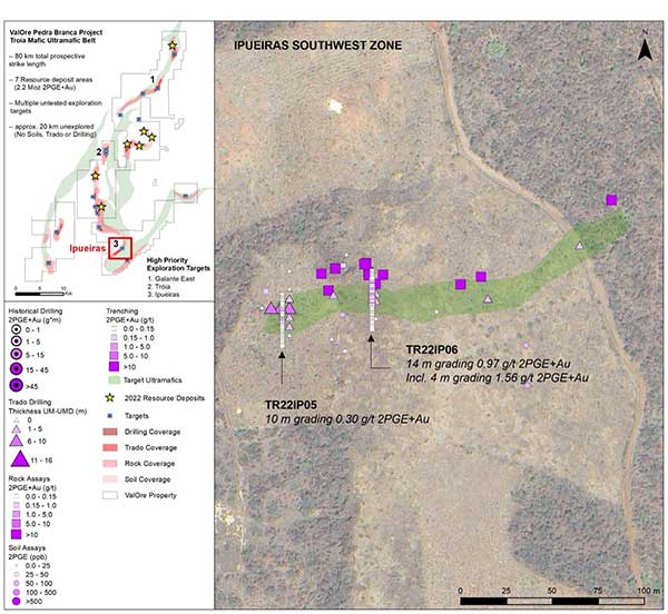 - 14 m grading 0.97 g/t 2PGE+Au, including 4 m grading 1.56 g/t 2PGE+Au - Trench TR22IP06 at the Ipueiras target.